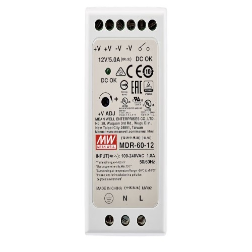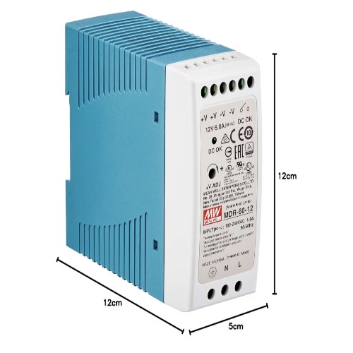 مزود الطاقة Mean Well MDR-60-12 هو حل موثوق واحترافي لتوفير طاقة مستقرة بجهد 12V DC وتيار 5A، مع تصميم صناعي مخصص للتركيب السريع على DIN Rail (Top-hat rail) داخل لوحات التحكم الكهربائية.