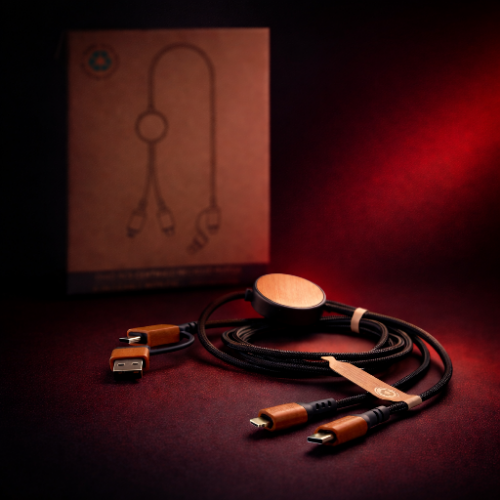 تم تصنيع الغلاف والموصلات من خشب الكرز المعتمد FSC®، بينما صُنعت الطبقة الخارجية للكابل من بوليستر معاد تدويره معتمد RCS، والجزء الداخلي من TPE معاد تدويره معتمد RCS.