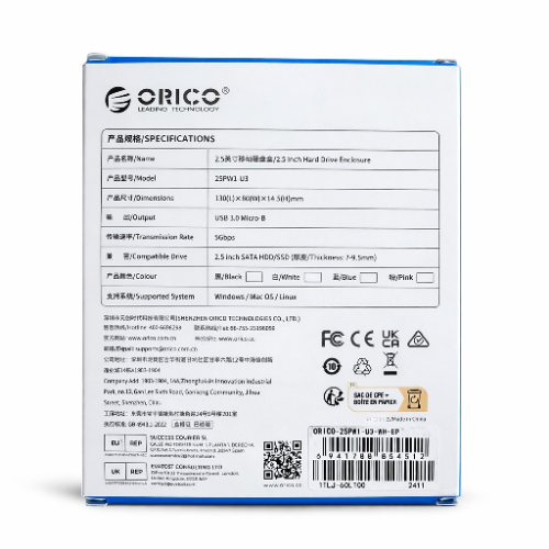 علبة خارجية عالية الجودة من ORICO لتحويل الهارد الداخلي 2.5 بوصة (HDD أو SSD) إلى هارد خارجي بمنفذ USB 3.0 بسرعة نقل تصل إلى 5Gbps، متوافقة مع أنظمة Windows وMac وLinux.